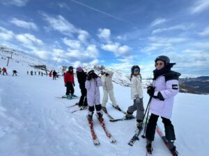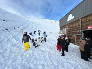 Nous avons profité du beau temps pour déjeuner à l’extérieur et jouer dans la neige avant le cours de ski de l’après-midi. Chacun progresse à son rythme et certains groupes ont déjà pris le tire-fesse!!! La journée a été bien remplie et fatigante. Le soir retour au centre, repas, petite veillée jeux de société et coucher pas trop tard.